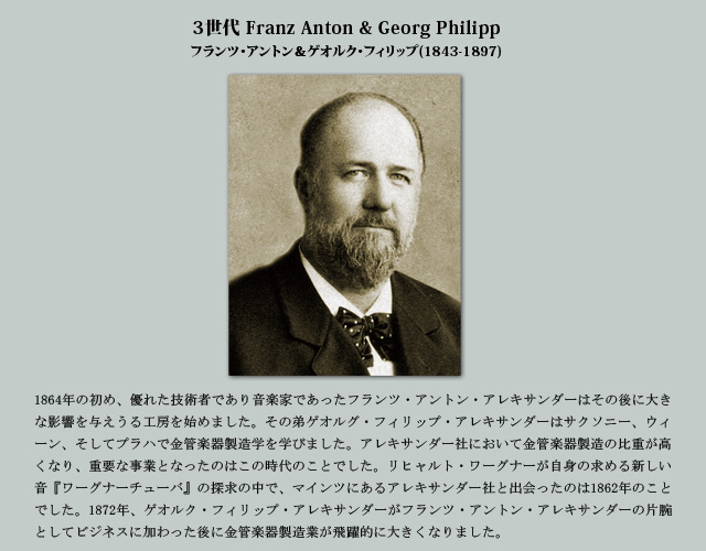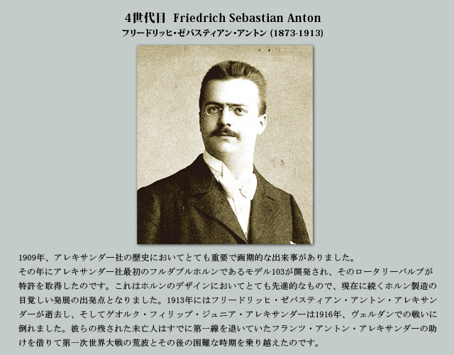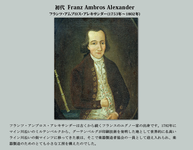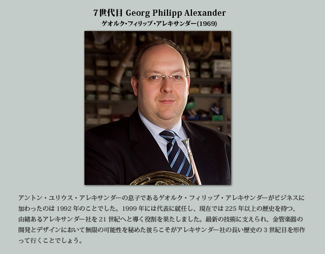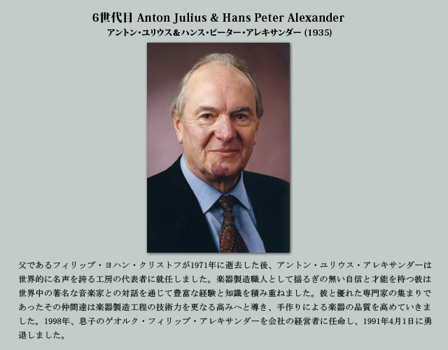 1782創業年以来、父から子へと脈々と引き継がれてきた楽器製造職人としての血筋はすでに7世代目を迎えています。その血脈すべてがアレキサンダー家一族のもとで引き継がれており、その名はいつの時代でも最も格調高く、最も革新的な楽器製造業者の一族として存在して来ました。 楽器製造業者としてのアレキサンダーの名はそれを構成する人々、つまり徒弟からマイスターまで、日々の献身、熟練した技術、長年に渡る経験によってアレキサンダー社を特別な存在へと導いている人々を表す言葉でもあります。