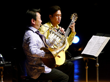 ラストはマンシーニの《ムーン・リバー》を切々と歌い上げた。もしかすると最後のアンコールこそが一番の聴きどころだったかもしれない。CDにも収録されているモーツァルト作曲(松尾俊介編)の《アヴェ・ヴェルム・コルプス》が丸山さんのフリューゲルと松尾さんのギターでしめやかに始まり、途中からヴィーナスによるホルンのハーモニーが加わるのだが、その美しさに思わずぞくっとさせられた。