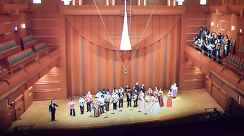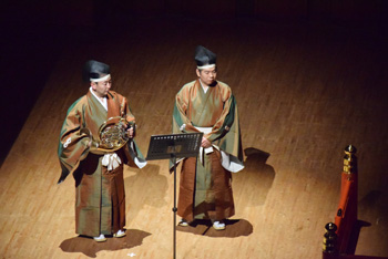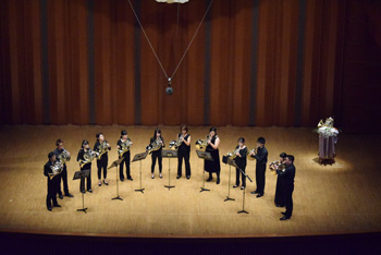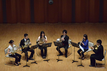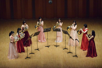 2団体目の「ホルン友の会」は前述のように、首都圏を中心とした音大生、卒業生の学校を越えた交流のために伊藤氏が提唱して作られたもの。この日も武蔵野音大、東京藝大、昭和音大、洗足学園と普段は別々の学校で学んでいる大学生による演奏で外山雄三《6本のホルンのための"パッサ・テンポ"》。この曲は故・千葉馨氏の依頼で作曲され、伊藤氏も所属していた東京ホルンクラブにより初演された。タイトルは「過ぎ去った時間」というような意味を持ち、曲調もどこか旧き良き時代を感じさせるもの。音大生による演奏はとても真面目で、丁寧な仕上げが好ましいが、ここに“音楽の生命力”のようなものが加わると、この日聴くことができた諸先輩方の演奏により近づけるように思えた。 |