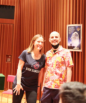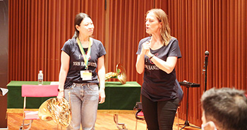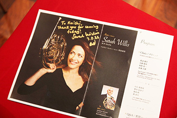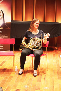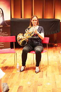 まずウォームアップと基礎練習に関して。サラは「常にいい音を出すことを心がけて」と言い、それにはジェームス・スタンプのトランペットのための教則本『ウォーム・アップと練習曲』を使うという。ベンディングも行なう。「F管を使うといい」「息と舌のシンクロナイズを大事に。attack(アタック)というよりproduction(音を作る)という意識」「スケールの練習は、(飽きないように)いつも同じではなくアーティキュレーションに変化を付ける」「きちんとゲシュトップを練習すると、本当に上手になれる」など参考になる話がたくさん出た。