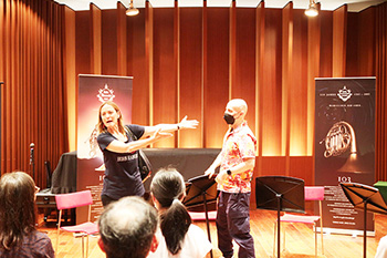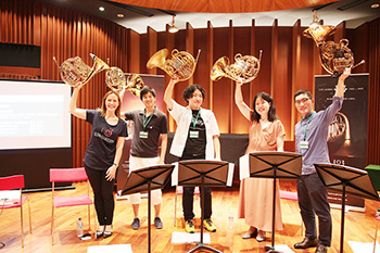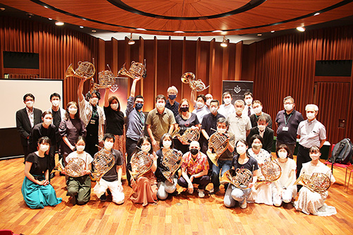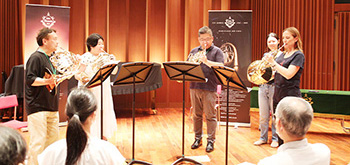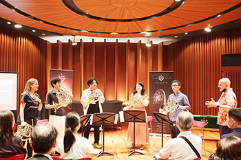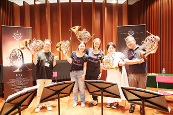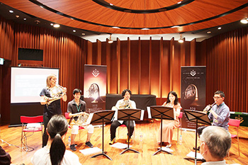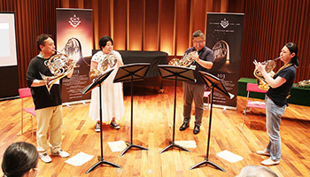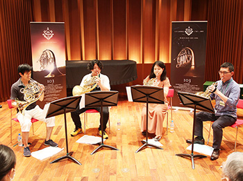 定番の「豊かな音量と音色で低音を吹くためには?」という質問には、「まず姿勢が大切です。いい姿勢を取って、そこに楽器を持ってくること」との答え。練習は「低域だけでなく、中域で大きな音を出すようにすることが大事。もし近所に迷惑がかかりそうなときは、ゲシュトップで練習するのもいいでしょう。低域のゲシュトップは難しいですが、たくさん練習してください」などと、実際に音を聴かせながらレクチャーしてくれた。 |