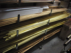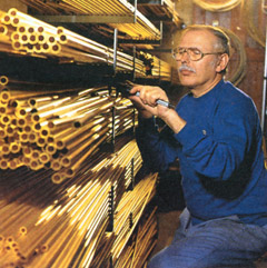 楽器製造においては、適切な材料の選択が極めて重要になります。アレキサンダー社は最高品質の原材料のみを使用しており、これは長年に渡って信頼出来る供給者から購入し続けているものです。また、材料寸法に対する一般水準よりもはるかに厳しい姿勢は、アレキサンダー社の許容差がドイツ工業規格(DIN)に定められたものよりはるかに少ないという事実に表れています。アレキサンダー社の製造する金管楽器の原材料には、銅70%と亜鉛30%が含まれ緑がかった黄色に見えるイエローブラス、銅と亜鉛が85%、15%の割合で含まれ多少赤みがかって見えるゴールドブラス、そして機械的な強度を要求される抜差管や接続部分、支柱などには強靭なニッケルシルバー(洋白:銅といくらかのニッケルから作られ、色は銀色)、以上3種類の異なる合金が使用されています。ご希望によっては、楽器全体をニッケルシルバーだけで作ることも可能です。酸の影響で耐久性への要求が厳しいマウスパイプの材質に関しては、耐久性に優れたゴールドブラスを使用しています。